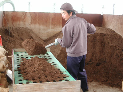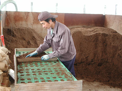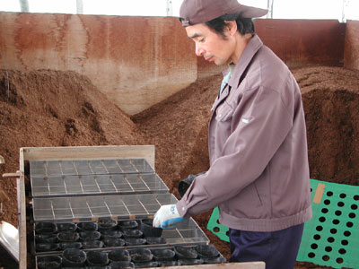 特注の型枠を 稲の苗箱に入れます