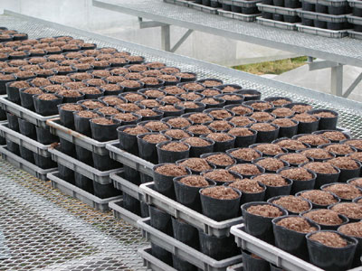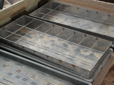 そこにポットを入れていきます 3×8で24ポット入ります 一回に120ポット(24ポット×5)詰めます